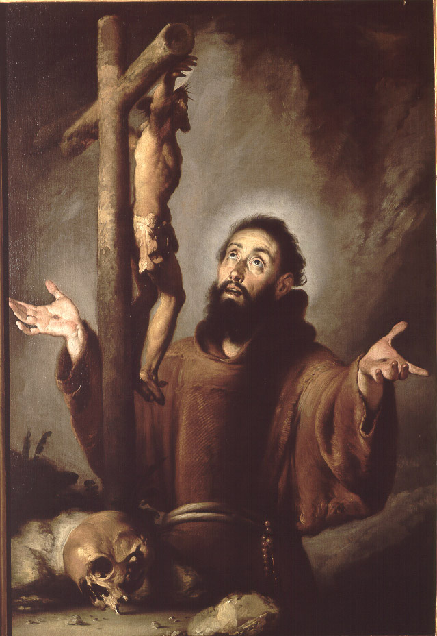 Murillo e il suo “San Francesco abbraccia Cristo crocifisso”, dipinto realizzato circa nel 1668 e conservato nel Museo di belle arti di Siviglia in Spagna. L’opera faceva parte di un ciclo commissionato al pittore spagnolo dai cappuccini per una cappella della chiesa del loro convento a Siviglia. Queste opere dovevano esaltare gli elementi distintivi della spiritualità francescana. Il quadro è di una bellezza sconvolgente; commuove lo spettatore che davanti a una simile tela rimane in silenzio, come in preghiera. La composizione simboleggia il momento culminante della vita di Francesco: la rinuncia a tutti i suoi beni materiali per abbracciare la vita religiosa. La composizione è armonica: accanto alla croce, due angeli reggono un libro aperto che reca in latino il passo del Vangelo secondo Luca: “Chiunque di voi non rinunzia a tutti i suoi averi, non può essere mio discepolo”. Ai piedi del santo vi è un mappamondo, un globo terrestre; Francesco sembra allontanarlo con un piede, metafora del suo rifiuto di ogni vanità.