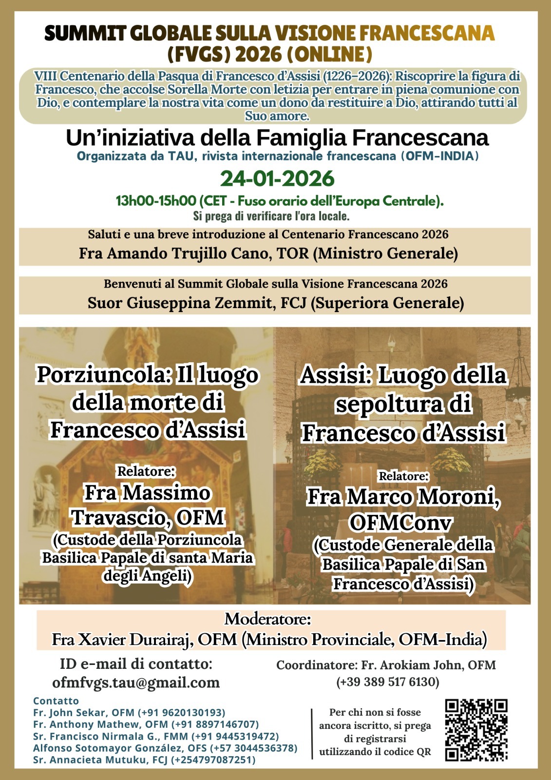 In occasione dell'ottavo Centenario della morte di san Francesco d'Assisi, la Famiglia Francescana promuove un importante momento di riflessione globale. Il 24 gennaio 2026, dalle 13:00 alle 15:00 (CET), si terrà online il "Summit Globale sulla Visione Francescana" (FVGS), un evento pensato per esplorare il significato profondo della morte come un dono restituito a Dio.
