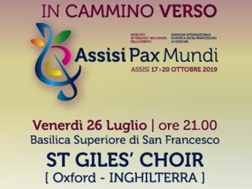 St Giles' Choir ad Assisi. L'appuntamento con il coro proveniente da Oxford, Inghilterra, è per venerdì 26 luglio, alle ore 21, presso la Basilica Superiore di San Francesco in Assisi. Come tutti gli appuntamenti di Assisi Pax Mundi si tratta di un concerto gratuito.