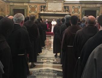 Il 23 novembre, nella Sala Clementina del Palazzo Apostolico, il Santo Padre Francesco ha ricevuto in Udienza i Membri delle Famiglie Francescane del Primo Ordine e del Terz’Ordine Regolare. A introdurre l’incontro è stato Fr. Mauro Jöhri, Ministro Generale dei Frati Minori Cappuccini, il quale ha ricordato al Santo Padre il cammino fin qui fatto assieme dalle Famiglie Francescane. Papa Francesco, a margine del suo intervento, ha commentato dicendo: “quello che state facendo è un bel cammino di minorità”. Al termine dell'incontro, il Santo Padre ha salutato singolarmente tutti i frati, mentre spontaneamente, tutti i frati intonavano Alto e Glorioso Dio e le Lodi a Dio Altissimo.