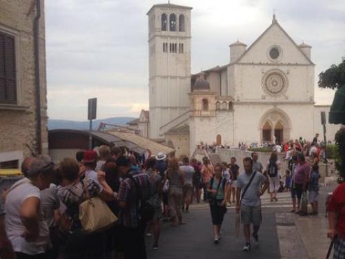 Lunghe code di pellegrini ad Assisi in prossimità dei controlli di sicurezza. Sono davvero numerosi i visitatori che in queste ore stanno visitando la città di Assisi. Tante persone nella Basilica Inferiore e Superiore. Complice anche un clima molto più piacevole rispetto al gran caldo dei giorni precedenti.