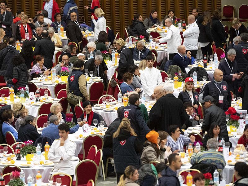 Sono le parole con cui Papa Francesco, facendo il suo ingresso in Aula Paolo VI intorno alle 12.20, ha dato il via anche quest'anno, al pranzo in occasione della Giornata Mondiale dei Poveri. 50 i volontari delle parrocchie romane che servono a 150 tavoli allestiti, i circa 1.500 bisognosi che provengono da Roma, dalle diocesi del Lazio, oltre che da diverse diocesi d’Italia e sono accompagnati dal personale delle associazioni di volontariato. Nel menù una lasagnetta, bocconcini di pollo alla crema di funghi e patate, dolce, frutta e caffè.