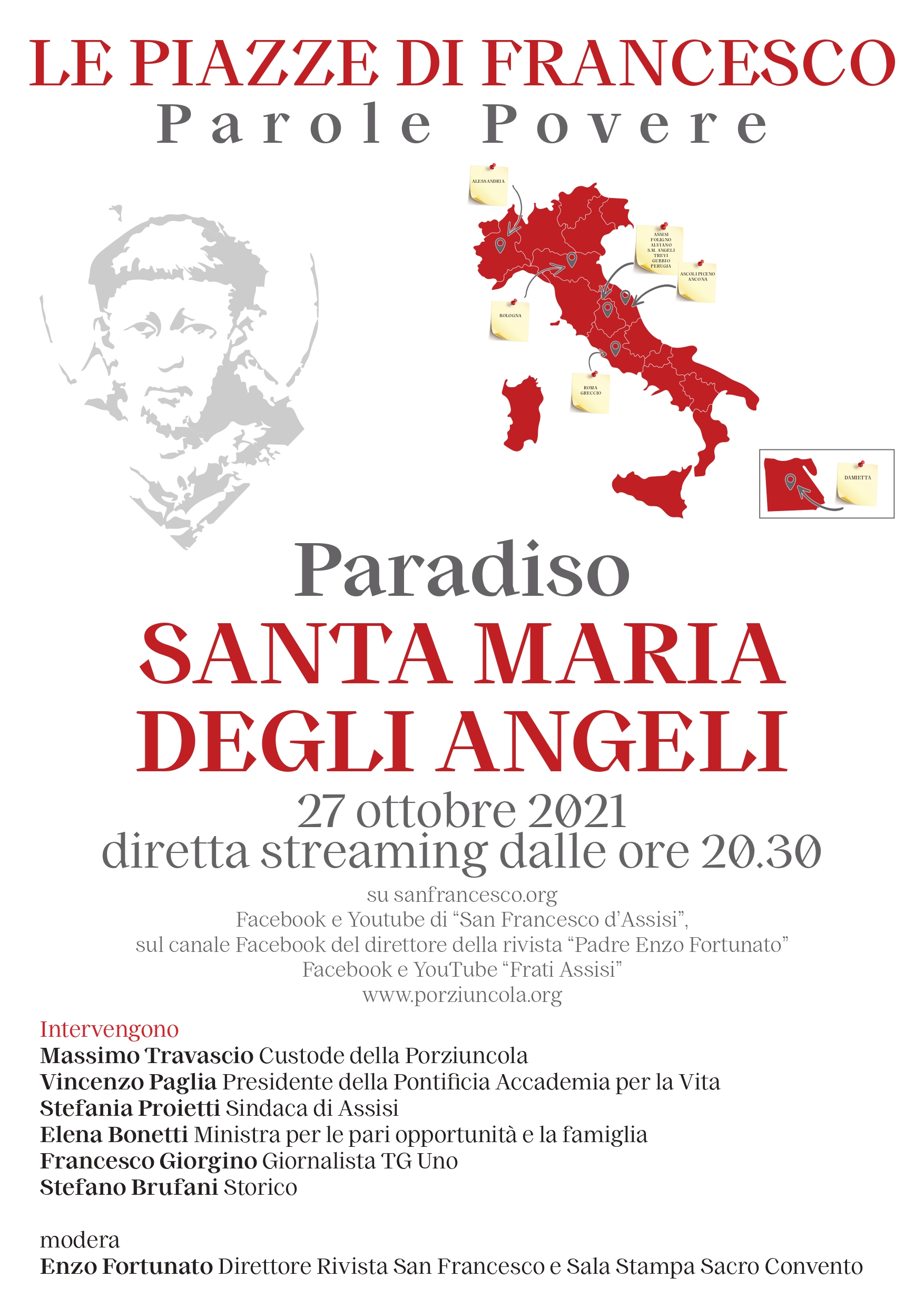 Ogni mese in dialogo in una piazza diversa d'Italia per celebrare San Francesco e il suo passaggio. Dopo Assisi, Foligno, Alviano, Ascoli Piceno, Perugia, Ancona, Alessandria e Roma, si ritorna ad Assisi, alla Porziuncola. L'evento verrà trasmesso in diretta streaming sul sito sanfrancesco.org, sulla pagina YouTube di San Francesco d'Assisi e sul canale Facebook del direttore della rivista padre Enzo Fortunato.
