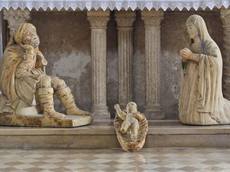 A partire da quel momento (anno 1709 circa) iniziò l’esodo delle statue superstiti del presepe: daprima furono spostate nella cripta, già adibita ad oratorio della scomparsa Confraternita della Madonna di Loreto (luogo in cui, tra l’altro, si svolgeva la tradizionale novena mattutina di Natale, che ancor’oggi si celebra nella chiesa superiore all’alba) e, da alcuni anni, nella collocazione attuale.