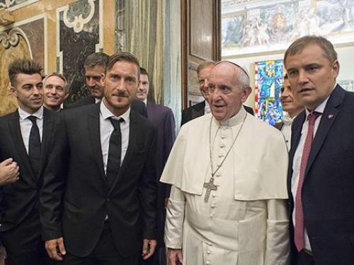 Il Papa ha incontrato nella Sala Clementina in Vaticano i calciatori della Roma e del San Lorenzo, il club argentino per cui ha sempre tifato, e che sabato alle 18.00 si affronteranno in un’amichevole all'Olimpico. L'incasso andrà alle popolazioni di Marche e Lazio colpite dal terremoto del 24 agosto.
