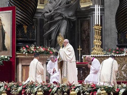 Nella sua omelia il Papa ha invitato a sostare davanti al presepe anche «per ringraziare di tutti i segni della generosità divina nella nostra vita e nella nostra storia, che si è manifestata in mille modi nella testimonianza di tanti volti che anonimamente hanno saputo rischiare». Ancora: «Sostiamo davanti al presepe per contemplare come Dio si è fatto presente durante tutto questo anno e così ricordarci che ogni tempo, ogni momento è portatore di grazia e di benedizione. Il presepe ci sfida a non dare nulla e nessuno per perduto». Guardare il presepe, ha detto ancora Francesco, «significa trovare la forza di prendere il nostro posto nella storia senza lamentarci e amareggiarci, senza chiuderci o evadere, senza cercare scorciatoie che ci privilegino. Guardare il presepe implica sapere che il tempo che ci attende richiede iniziative piene di audacia e di speranza, come pure di rinunciare a vani protagonismi o a lotte interminabili per apparire». Guardare il presepe «è scoprire come Dio si coinvolge coinvolgendoci, rendendoci parte della sua opera, invitandoci ad accogliere con coraggio e decisione il futuro che ci sta davanti».