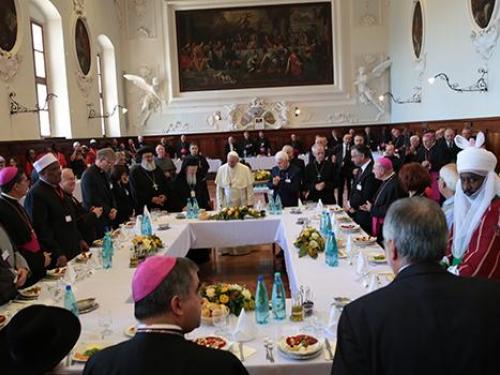 Papa Francesco ha pranzato nel refettorio del Sacro Convento di Assisi. Seduti al tavolo con lui venticinque personalità.