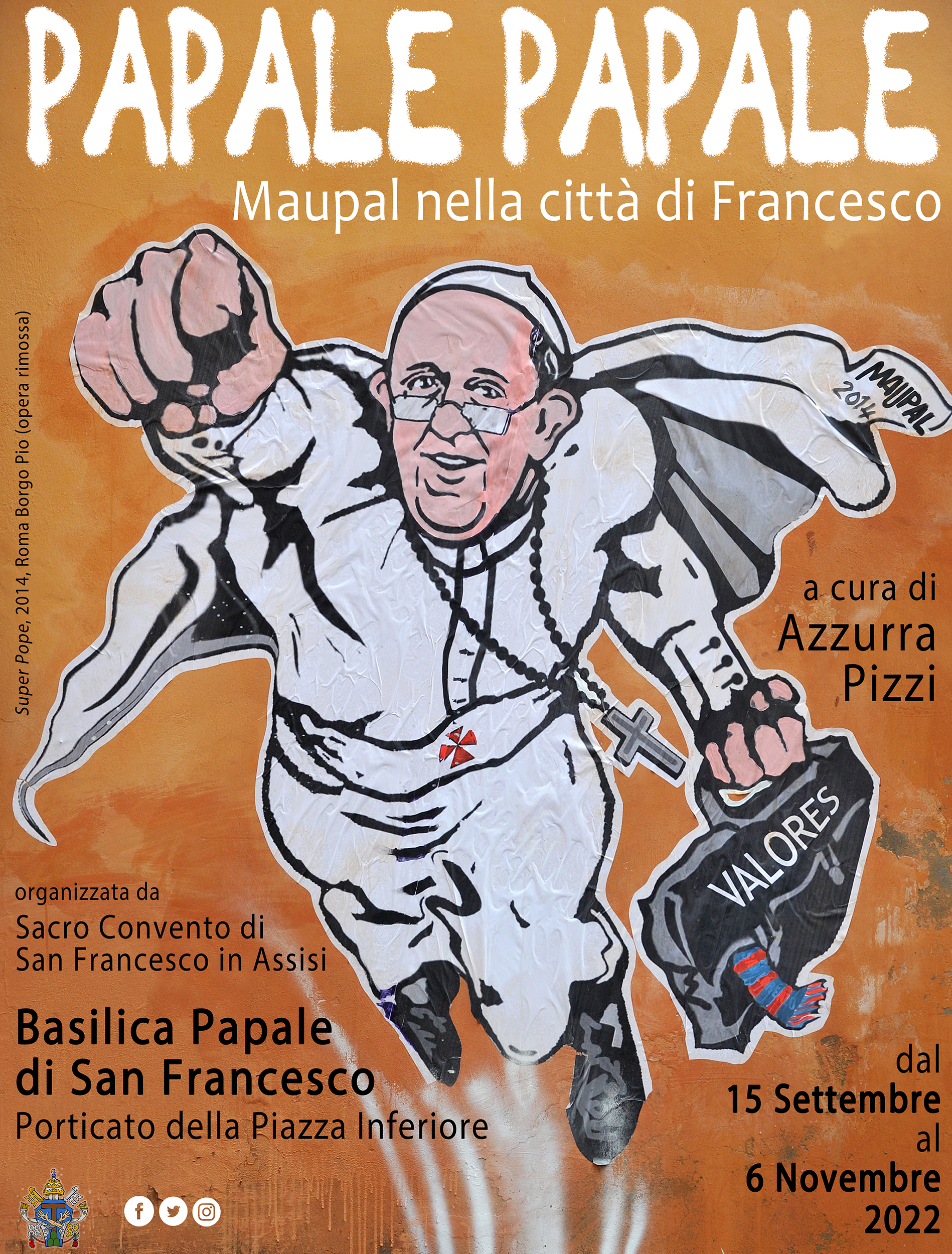 Verrà presentata, giovedì 15 settembre alle 11 nella Sala Stampa del Sacro Convento di Assisi, l’esposizione artistica di Maupal dal titolo “Papale Papale”. Dal 15 settembre al 6 novembre saranno allestite, nel portico meridionale della piazza inferiore della Basilica di San Francesco, le opere più significative dell’urban artist Mauro Pallotta, in arte Maupal, sulla figura di Papa Francesco.