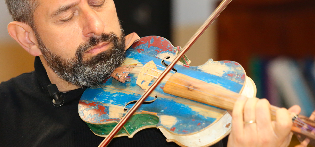 Si comincia chiedendo a Francesco Tuccio, il falegname che ha realizzato la Croce di Lampedusa, di fornire legni per creare presepi: «Nel 2021, nel momento più acuto del Covid, proposi di realizzare dei presepi con i legni dei barconi che approdano a Lampedusa: volevamo trasmettere un segno di vicinanza a tutti, che fossero credenti o meno». In quell’occasione viene costruito anche un violino. È l’atto di nascita del Violino del Mare: «All’inizio non pensavamo potesse suonare. Invece non solo poteva, ma dava vita a un suono che tocca l’anima», racconta Arnoldo Mosca Mondadori. «Andrea, uno dei detenuti assunti che lavorano nella liuteria, mi suggerì di chiedere al governo di far arrivare le barche al carcere di Opera invece di farle distruggere. Quello è stato il momento in cui ho pensato che da un violino si sarebbe potuta realizzare un’intera Orchestra del Mare. I liutai Enrico Allorto e Carlo Chiesa insieme a Vincenzo, Claudio, Nicolae e Andrea – i detenuti del laboratorio – hanno iniziato a lavorare all’orchestra per dare voce ad ogni persona che fugge dalla guerra e dalla miseria, e per mettere al centro l’articolo 27 della Costituzione italiana. Tutto questo fatto con la forza della musica».