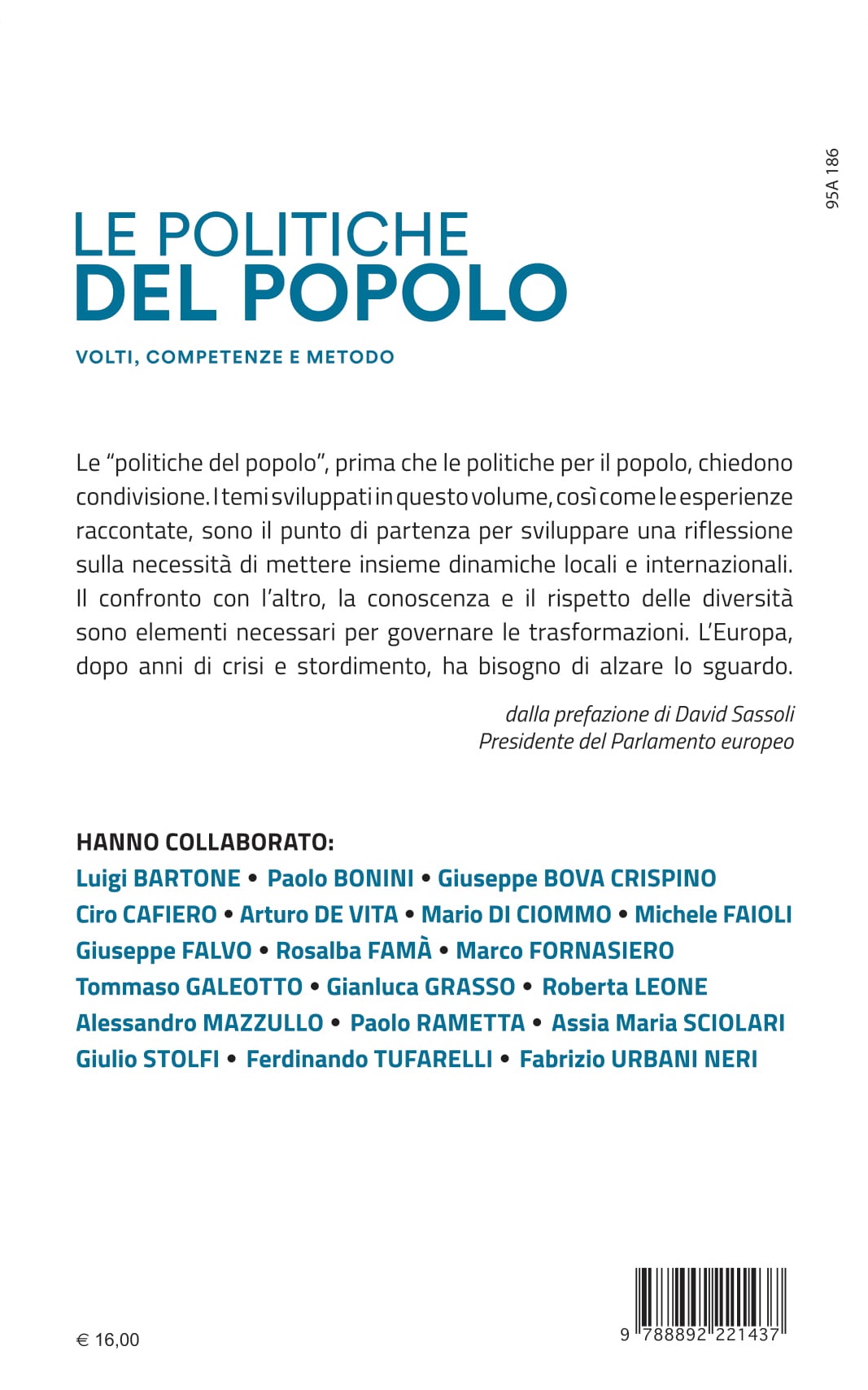 1. Anzitutto la prefazione del Presidente del Parlamento europeo, David Sassoli in cui ci scrive che esperienze di comunità che pensano la politica sono il futuro dell’Europa: “Le “politiche del popolo”, prima che le politiche per il popolo, chiedono condivisione. I temi sviluppati in questo volume, così come le esperienze raccontate, sono il punto di partenza per sviluppare una riflessione sulla necessità di mettere insieme dinamiche locali e internazionali”. E ancora: “E qui c’è l’intuizione di questo libro: connettere le persone alle esperienze, condividere le competenze e sostenere i giovani ad assumersi responsabilità”.