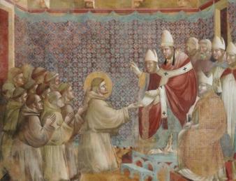 La frase è in realtà ripresa dall'incipit della Solet annuere di Onorio III, che risale al 1223. Tanto il papa con i cardinali di curia, tanto Francesco con i suoi compagni compaiono all'interno di un grandioso salone, apparentemente il Palazzo Lateranense a Roma, che ha le pareti rivestite da pesanti tendaggi e un soffitto piano appoggiato su poderosi archivolti, a riprova dello studio dell’architettura antica compiuto dal pittore, e una profonda sensibilità verso la raffigurazione di uno spazio abitabile di proporzioni monumentali. La strana forma della giornata che contiene la figura di Francesco, cioè la stesura d’intonaco poi dipinta con la tecnica dell’affresco, lascia supporre che nel progetto originario il santo dovesse ricevere la regola in posizione eretta, e che in corso d’opera fosse adottata la soluzione di piegare Francesco in ginocchio, forse per dare più importanza alla figura del papa, o meglio ancora per ribadire la minorità della scelta di Francesco: la mia debolezza è la mia forza, avrebbe detto con l'apostolo Paolo.