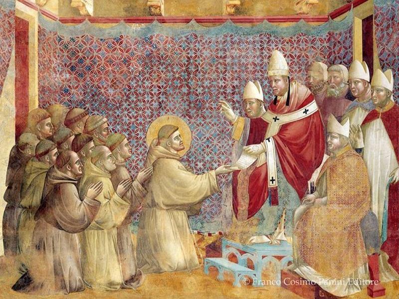 Francesco di Assisi, tuttavia, riuscì a ottenere una deroga alle decisioni del concilio, potendo in tal modo vedere confermata la “sua” Regola. L’azzardata decisione, che poteva costituire – e di fatto costituiva – un precedente pericoloso per la Curia romana, fu resa possibile grazie a una fictio iuris di cui tutti erano consapevoli, compreso lo stesso Francesco (poco dopo un’identica concessione, per le stesse motivazioni, sarà estesa anche ai carmelitani). E che si trattasse di una “finzione giuridica” lo mostra il fatto – poco o nulla sottolineato dalla storiografia – che nella prima opera del corpus agiografico francescano, la Vita beati Francisci di Tommaso da Celano (1228-1229), nulla si dicesse della conferma da parte di Onorio III, limitandosi l’agiografo a ricordare l’approvazione data da Innocenzo III. Il percorso sarebbe dunque iniziato e si sarebbe concluso con quel grande pontefice: questo è quanto si voleva far credere e l’affresco assisano ne costituisce una riprova.