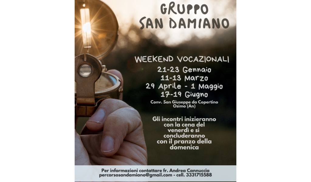 Gli incontri inizieranno con la cena del venerdì e si concluderanno con il pranzo della domenica. I weekend vocazionali sono quattro: 21-23 gennaio, 11-13 marzo 29aprile-1maggio e 17-19 giugno. Frate Andrea Cannuccia si sta occupando dell’organizzazione degli eventi.